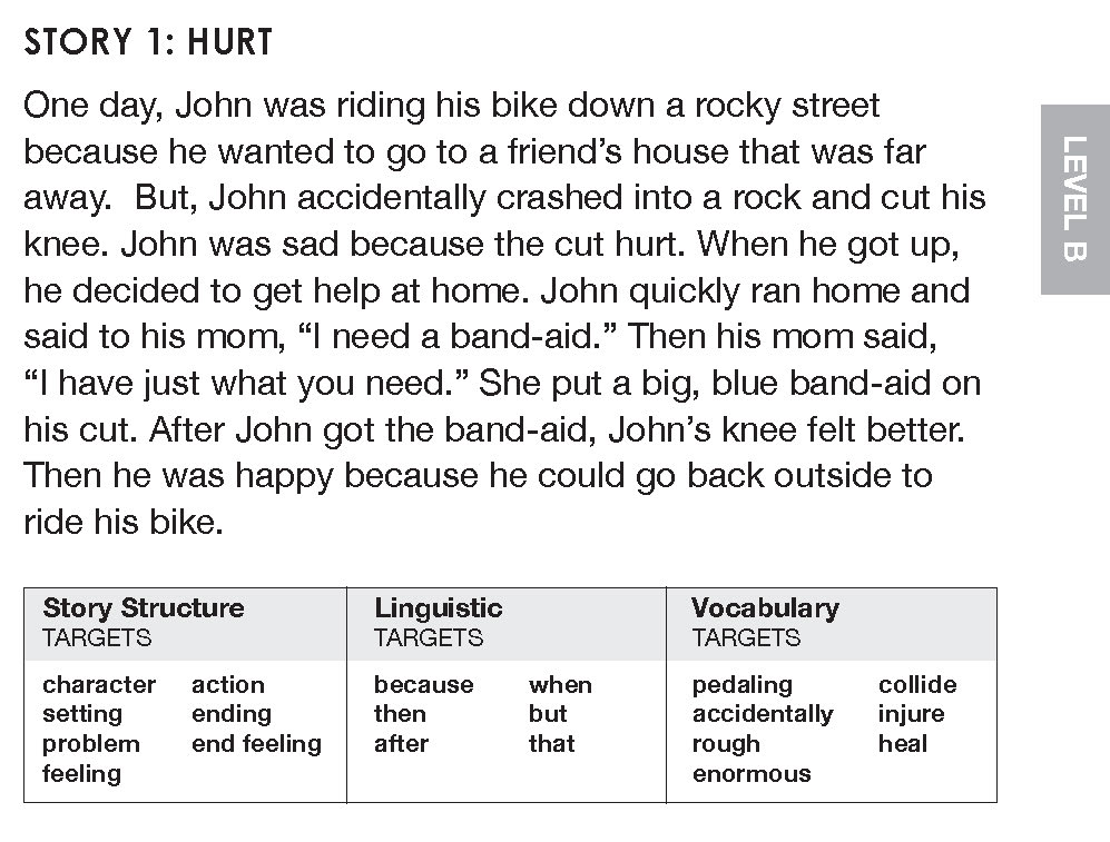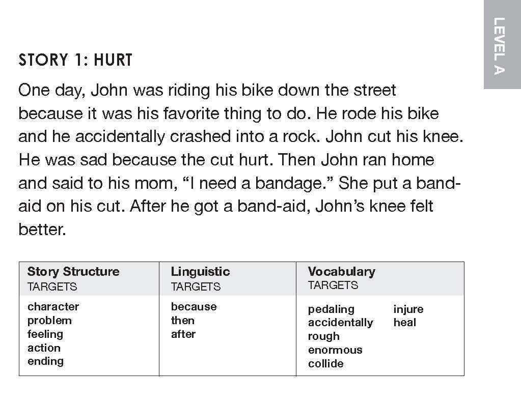 The first 12 stories of the program are typically needed when students first begin the program. They are simple stories used to initially teach story structure. There are two levels of each of the 12 stories. Level A stories align with expectations in preschool and beginning of kindergarten. Level B stories correspond to kindergarten and first grade expectations.